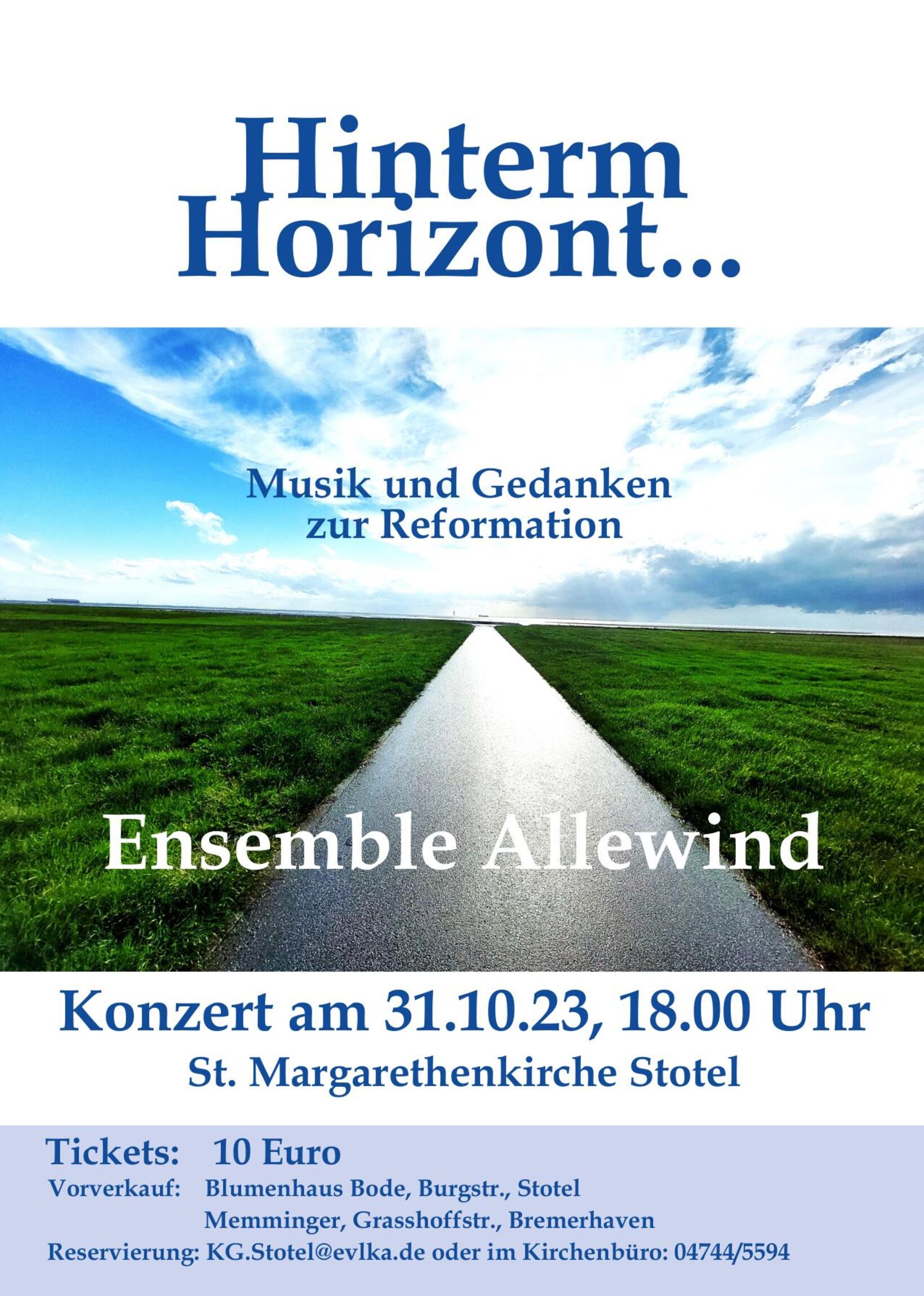 "Hinterm Horizont... - Musik und Gedanken zur Reformation", lautet der Titel des nun schon traditionellen Konzerts zum Reformationstag in der Stoteler Kirche. Hinterm Horizont - welcher ist der Meine und kann ich darüber hinaus, weiter sehen? Texte und Musik stehen wie immer in diesen Konzerten in innigem Verhältnis zueinander.