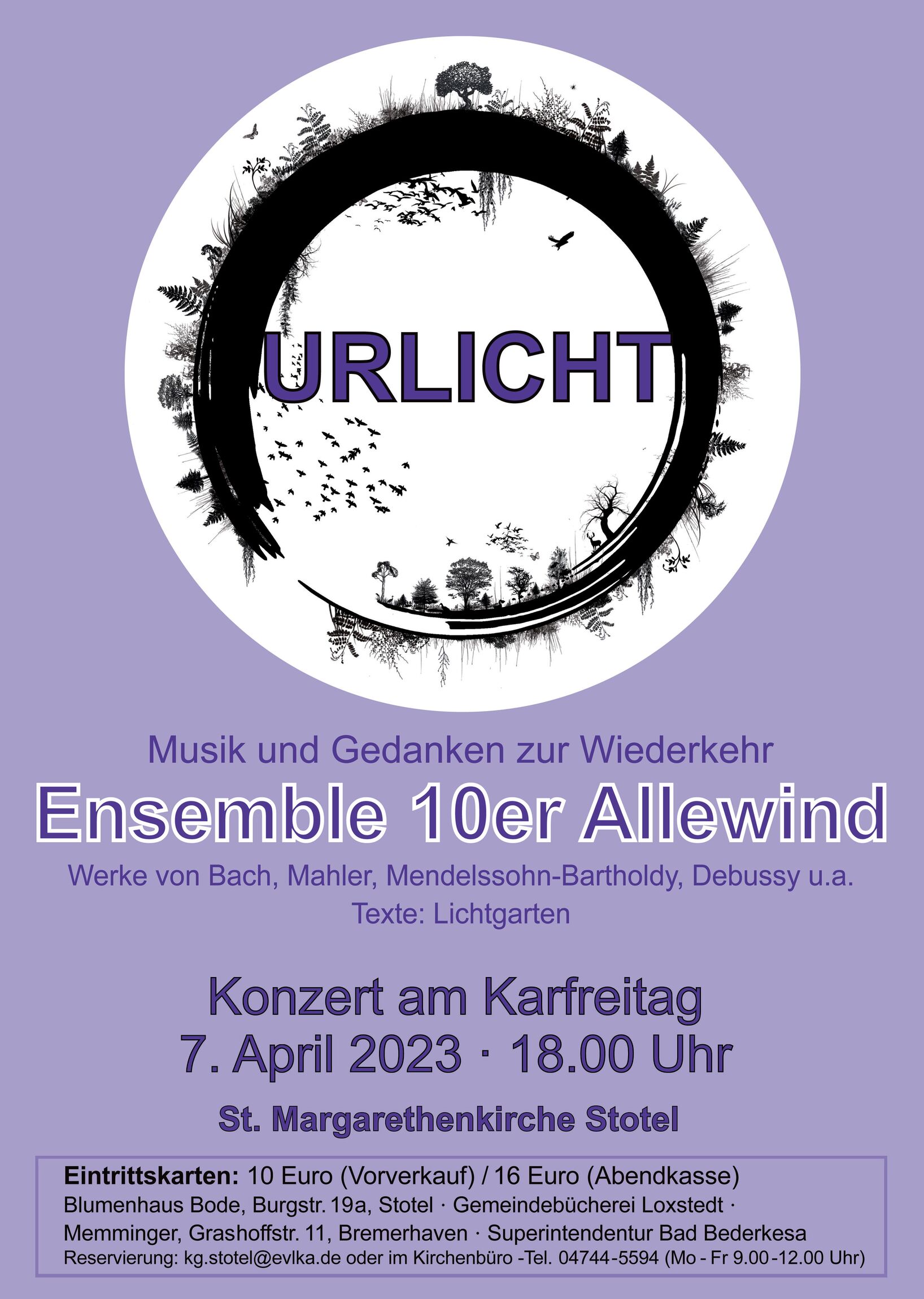 Das Ensemble Allewind spielt in 10er-Besetzung Werke von Bach, Mahler, Debussy und Mendelsohn-Bartholdy eingebettet in Texte und Projektionen des Bremerhavener Künstlers Lichtgarten. Dazu erklingt die renovierte und um fünf Register erweiterte Stoteler Hillebrandorgel in neuem Klanggewand nach dreimonatiger Baupause wieder zum ersten Mal.