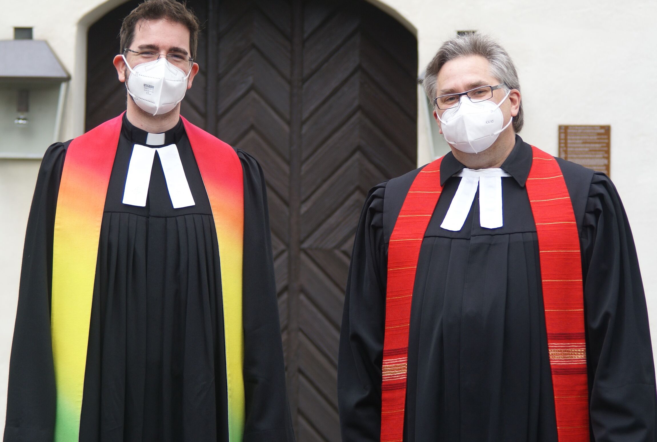 Zwei Pastoren teilen sich in den kommenden drei Jahren die gemeinsame Pfarrstelle der Kirchengemeinden St. Margarethen in Stotel und St. Marien in Büttel. Zur Begrüßung von Pastor Michael Behrens machten sie im Altarraum gemeinsame Sache.