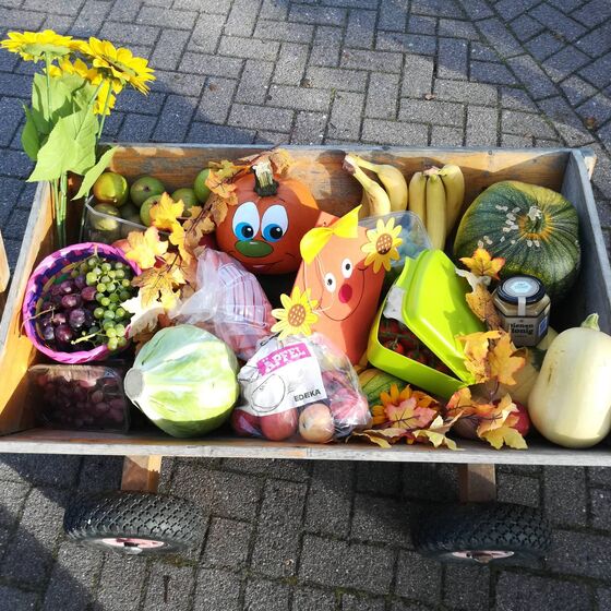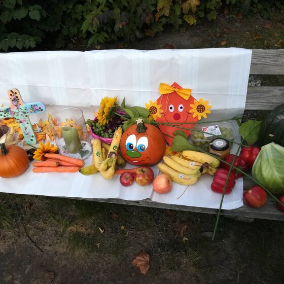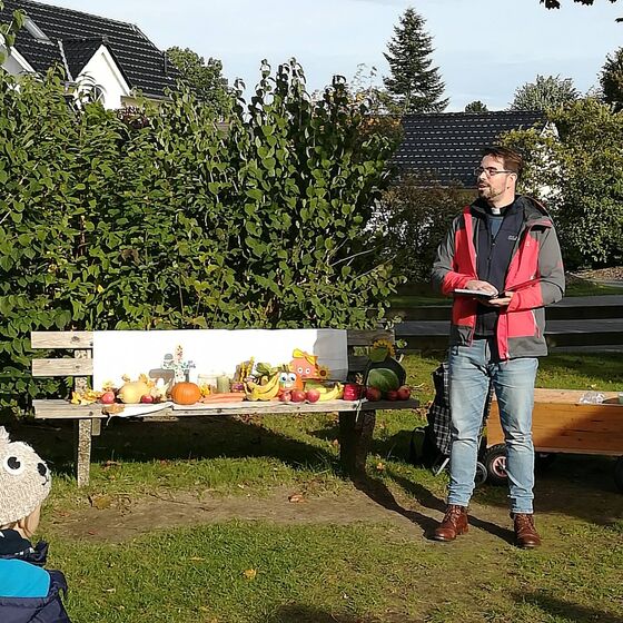 Bei wundervollem Wetter machten sich die Kinder und die Mitarbeiterinnen der Kita "Hummelhus" sowie Pastor Michael Behrens auf den Weg, um auf dem Spielplatz Nesse eine kleine Erntedank-Andacht zu halten. Weit mussten sie nicht gehen, dafür aber eine Straße überqueren. Als alle angekommen waren, wurde erstmal ein Lied mit Bewegungen gesungen. Danach erzählte Pastor Behrens eine Geschichte über einen Esel, ein paar Vögel, einen Igel und reifen Äpfeln. Wie wunderbar, dass die Kinder auch einige dabei hatten. Aber nicht nur das, sondern ganz viele Dinge die wir ernten durften und für die wir dankbar sind. Nach der Andacht durften sich alle auf dem Spielplatz nochmal austoben, bevor es dann auf den Rückweg ging.